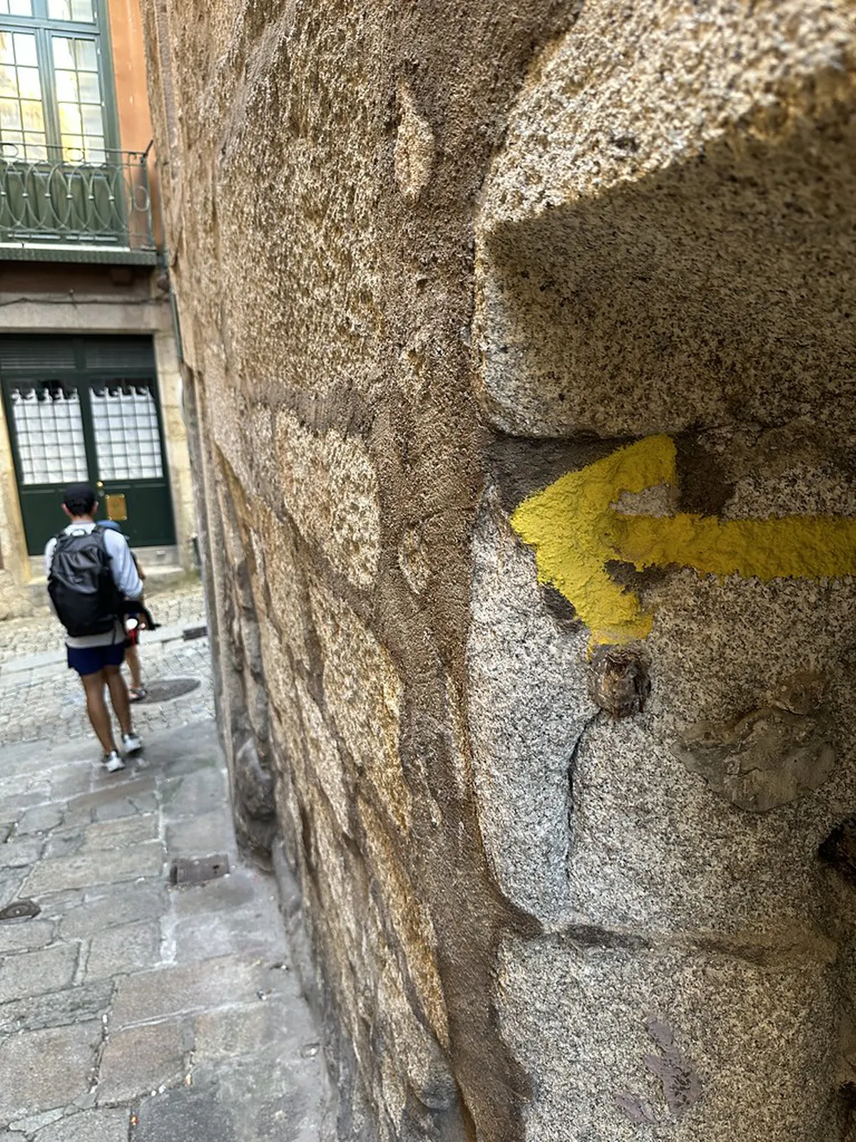 The old town has many narrow and winding streets. Arrows are often painted on the corners of granite buildings. Look for small yellow symbols near the ground level. These markers keep you on the Portuguese Coastal Way Viana section today.